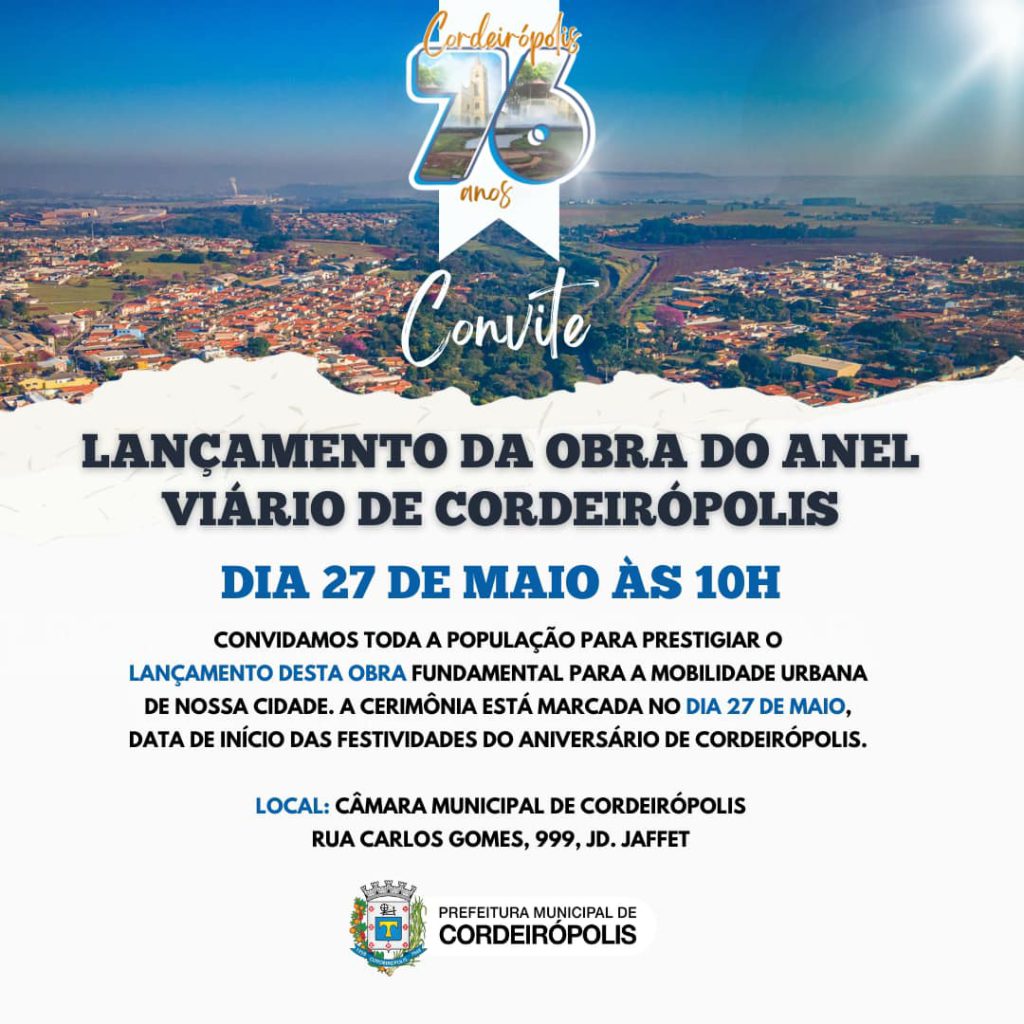 Convite: População de Cordeirópolis venha participar da cerimônia de lançamento da Obra do Anel viário do município. Com investimento de R$ 101 milhões através do FINISA/Caixa e a contrapartida da Prefeitura Municipal, o anel terá 15 km de extensão e um prazo de execução de 24 meses.